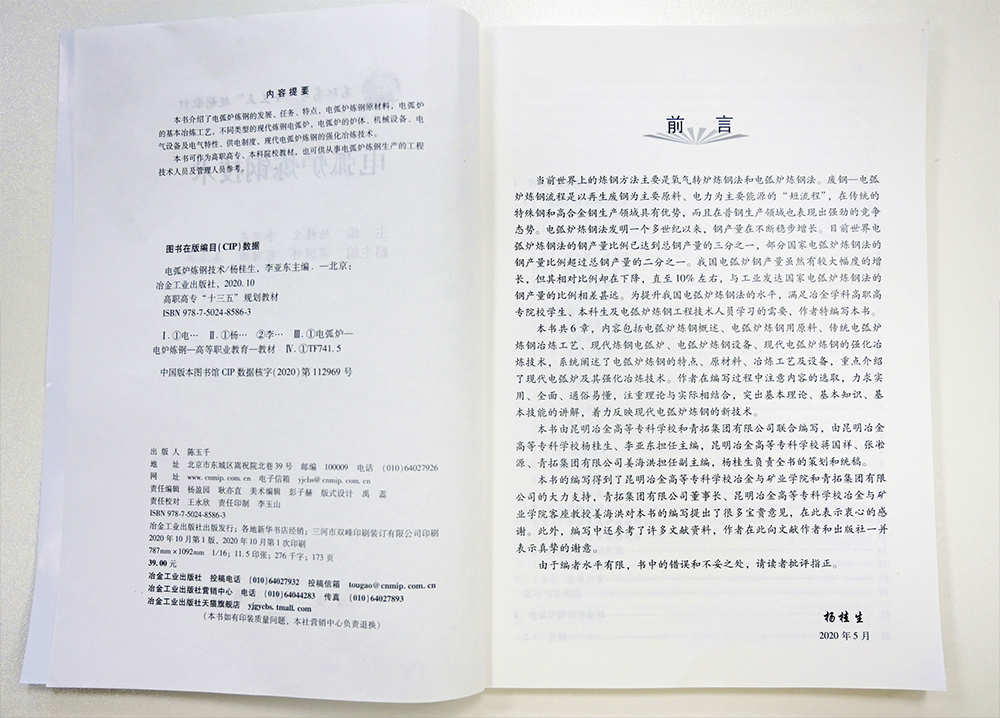 近日,由冶金工业出版社出版的高职高专“十三五”规划教材《电弧炉炼钢技术》正式发行。该书由昆明冶金高等专科学校和青拓集团有限公司联合编写,由昆明冶专杨桂生、李亚东担任主编,昆明冶专蒋国祥、张凇源,青拓集团姜海洪担任副主编,杨桂生负责全书的策划和统稿。