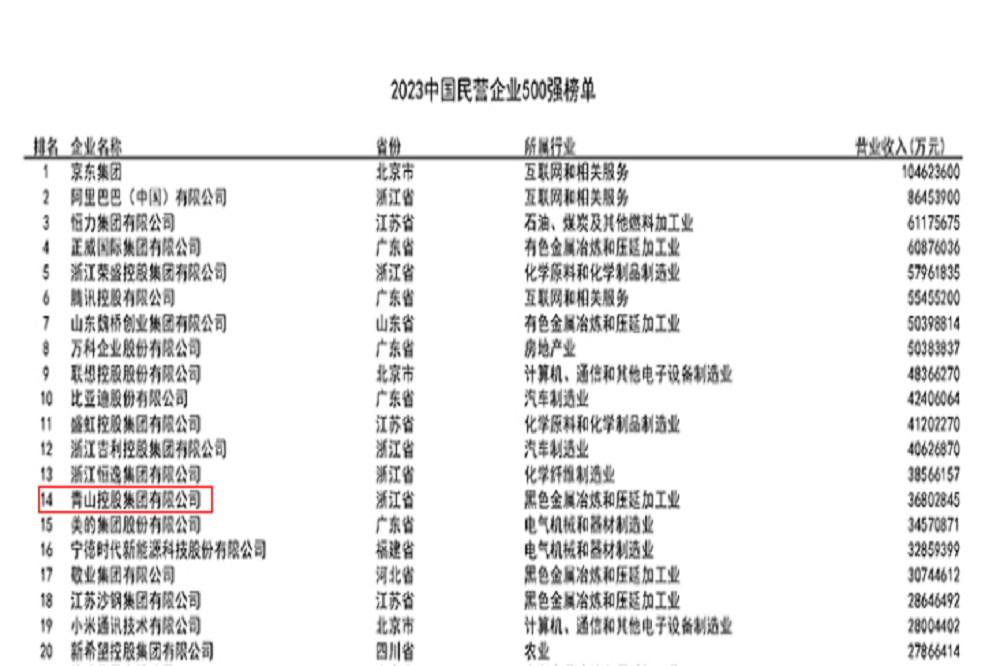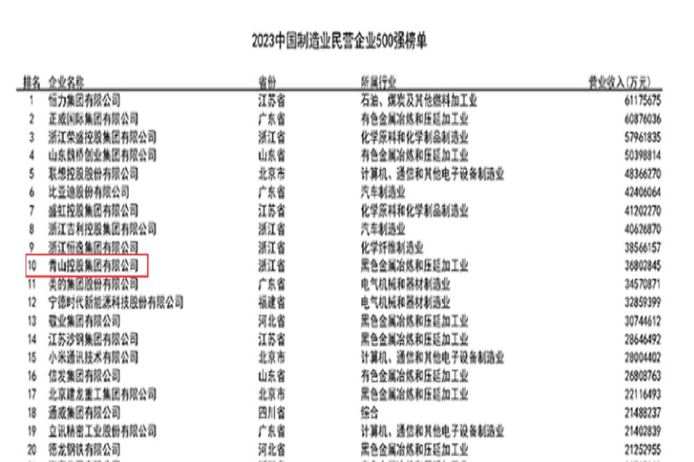 中国制造业民营企业500强第10位